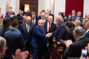Governor Morrisey shakes hands as he enters the House of Delegates Chamber for his second State of the State. Photographed by Perry Bennett.