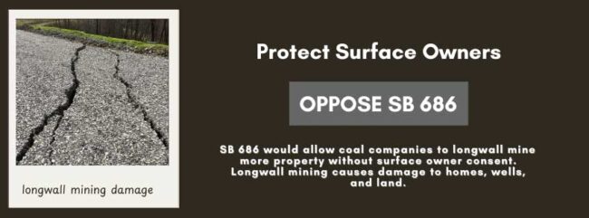 Hi {contact.email_greeting}, SB 686 would allow coal companies to longwall mine with approval from ONLY 75% of the co-tenants, or people who share ownership of the coal underlying the surface. This bill would allow more people’s homes and properties to be damaged or destroyed by longwall coal mine subsidence with too little or no compensation because it lacks the surface owner protections included in the cotenancy law that passed for oil and gas companies. That law forbids surface disturbance without the surface owner’s consent if the oil and gas law is used. Using cotenancy for the purposes of longwall mining without requiring the consent of surface owners amounts to “forced subsidence.” Subsidence causes serious damage to properties, cracking foundations, draining drinking water tables, breaking gas and water lines, and reducing property values. The damage can even cause water wells to permanently dry — depleting a resident’s water source. SB 686 is currently in the House Energy and Public Works Committee, then it will head to House Judiciary. Please reach out to your representatives and urge them to REJECT SB 686. |